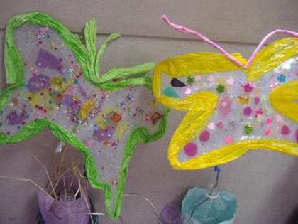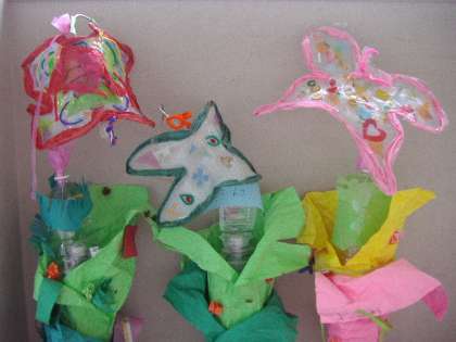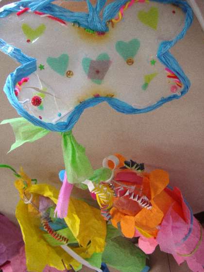 透き通る羽に飾りをたくさんつけました。思い思いの花、植物のまわりをはばたいています。