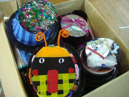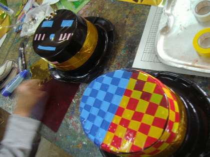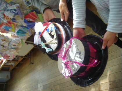 運動会の演技種目、「コーラスライン、ワン」のすてきなシルクハットをおしゃれに飾っています。できあがったらみんなでタワーのように高くとりつける予定です。