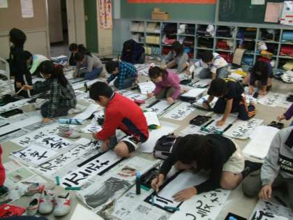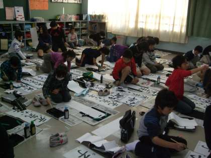 書き初め用の半紙はいつもより長いため、机をすべて廊下に出し、床に新聞紙を広げて書きました。いつもと違う形式のためか、いい緊張感をもって書くことができていました。