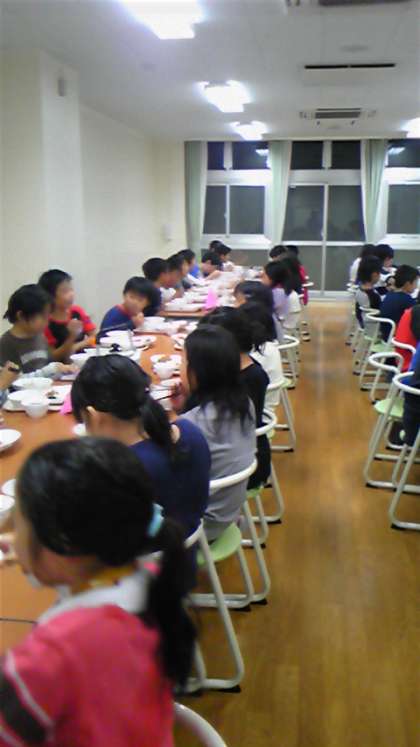 二日目の夕食です。食事係が頑張ってくれるので準備も早くなりました。今日のメインは郷土料理のサンガ焼きです。今日の楽しかったことを話しながら、仲良く食べています。
