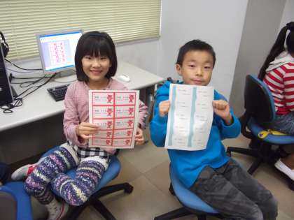 休憩時間には、さっそく作った名刺を交換して遊んでいました。