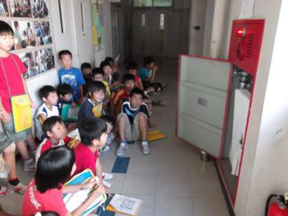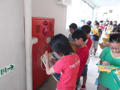 社会科の授業で、学校内の消防設備を探しに行きました。