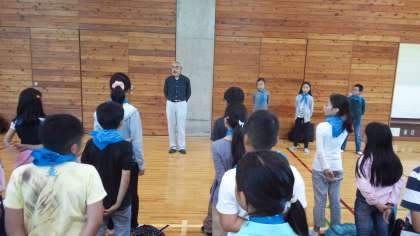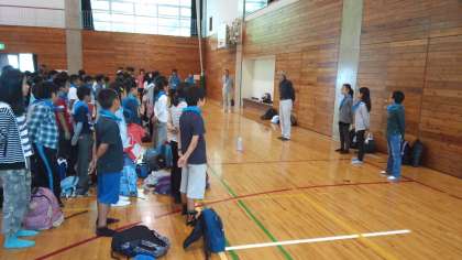学園到着後にすぐに開室式を行いました。よい思い出をたくさん作るためにも、協力して持てる力を発揮します。