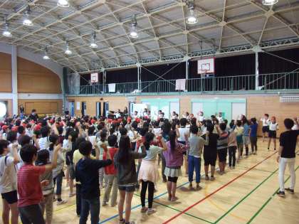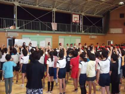 運動会の練習が始まっています。今日は音楽朝会で子どもたちの大好きな「GO!GO!GO!」を歌いました。応援団が前に立ってかけ声も元気よく全員が「本番モード」で歌いました。ますます気持ちが高まっていきます。その元気な歌声で、「校歌」も上手に歌えました。