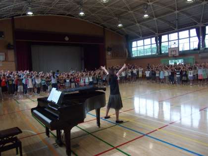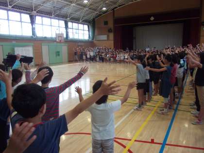 低学年と高学年で違うパートを歌い、きれいなハーモニーが響きました。今朝は、いつもと並び方を変え、1年生と6年生、2年生と4年生、3年生と5年生が近くに並んでペアを組む形で歌声を合わせました。