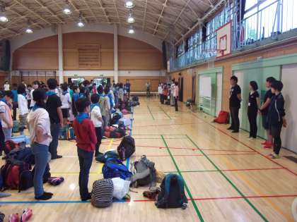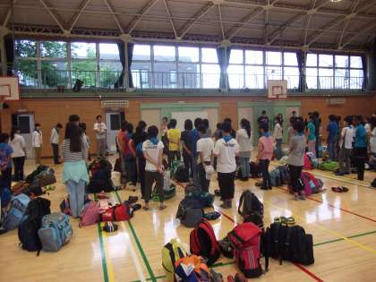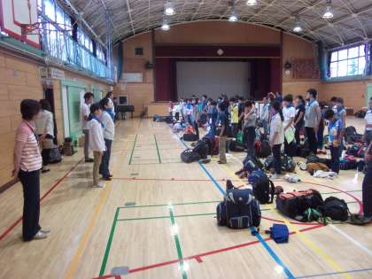 初日は雨模様の天候となり、体育館で出発式を行いました。6年生70名全員が元気に参加できました。この4日間で多くのことを学び、楽しく有意義な宿泊体験教室にしてほしいです。