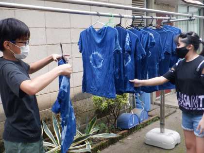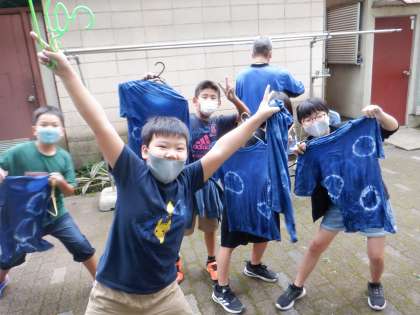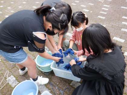 校庭の不動村で育てた藍を使って、運動会で使用する衣装を染めました。