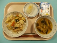 【今日の献立】スタミナ丼呉汁果物(柿)牛乳 今日は体力を回復し、明日に備える給食...