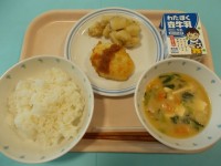 【今日の献立】ご飯お魚ハンバーグ おろしソースジャーマンポテト豆乳入りみそ汁牛乳...