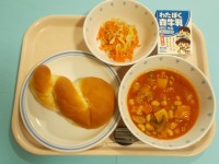 【今日の献立】ココア揚げパン豚肉と大豆のトマト煮粒マスタードドレッシングサラダ牛...