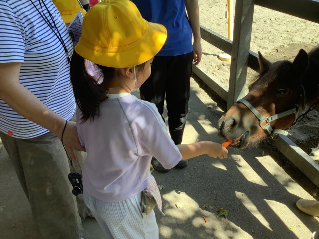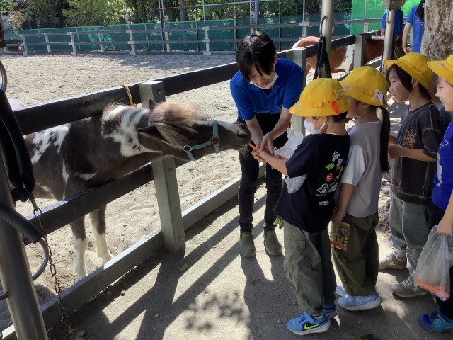 次は餌のにんじんをあげました。とても食欲旺盛でにんじんに食らいついてくるので、最初は飼育員さんと一緒に挑戦しましたが、2回目には慣れて1人であげられる子もいました。