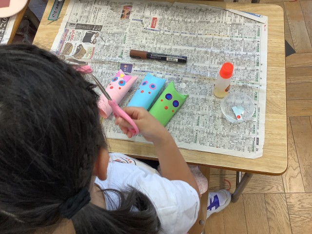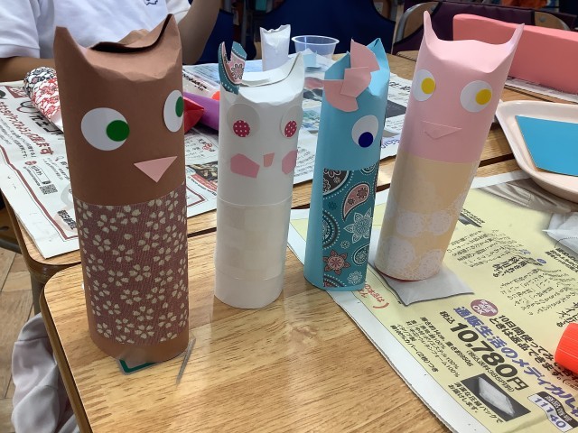 紙を巻くだけではなく、折ったり、潰したりして作る方法を考え出した子もいました。目や尻尾、手足も付け足していき、可愛らしい生き物ができあがっていました。
