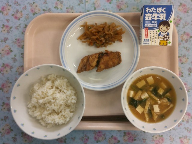 鯵の竜田揚げは、にんにく・しょうゆ・酒で下味をつけてから、小麦粉・片栗粉をまぶして油でカラッと揚げました。魚をおいしく食べられます。今日もよく食べていました。