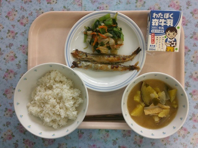 成長期の子ども達は骨の成長が活発です。骨づくりに必要なカルシウムをはじめとした栄養素を種実・野菜・大豆製品・小魚・乳製品・海藻など、様々な食材から摂取できるように献立を工夫しています。1年2組にはししゃもが大好きな児童がいて「ししゃもがもっとたくさん食べたいです!」と話しかけてくれました。