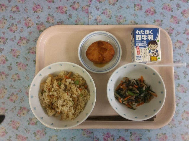 埼玉県の郷土料理です。かてめしは、米の生産量が比較的少ない地域でかさましの為に野菜等を加えた炊き込みご飯のことです。今日は高野豆腐も入れました。ゼリーフライは、小判型をしていたので「銭フライ」と呼ばれていましたが、次第に「ゼリーフライ」と呼ばれるようになったそうです。10月の献立表を渡した日から「ゼリーフライってなんだろう?」と気になっていた児童もいました。給食で味わってみると「コロッケみたい!」と人気でした。