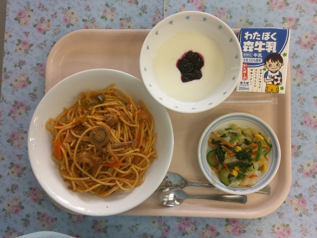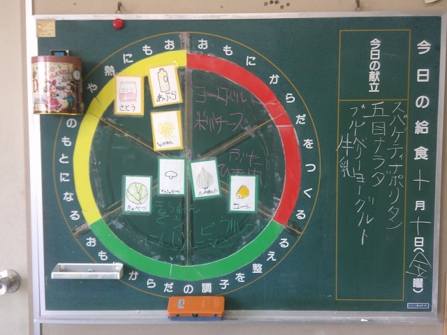 10月10日は目の愛護デーです。ルテインが入っているほうれんそうと、アントシアニンが入っているブルーベリーを使用した献立にしました。「ブルーベリーヨーグルトがおいしいです!」と嬉しそうに声をかけてくれた児童が多くいました。
