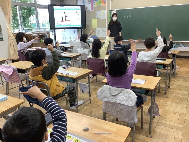 10/21 2年生国語 公開日 2025/10/21 更新日 2025/10/21 今日のできごと 「止」と「西」という漢字を学習しました。空がきでしっかりと書き順を確認してからワークブックで練習します。姿勢良く書くことができました。