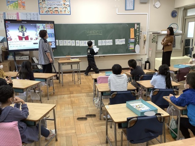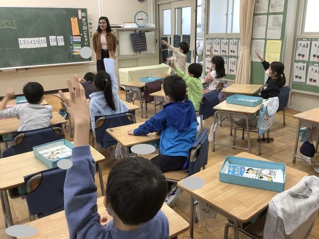 隠された数字を当てるゲームを行いました。「I know!」と元気に手が上がっていました。