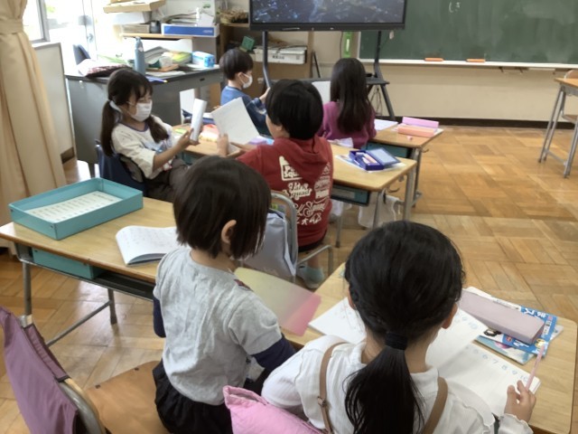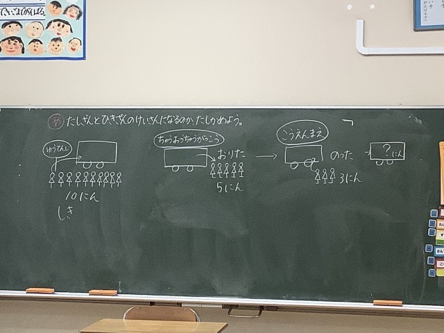 10/23 1年生算数 公開日 2025/10/23 更新日 2025/10/23 今日のできごと 算数の問題を考えました。式、答えまでできたら、隣の友達とどうしてそうなったかを教え合いました。「まず最初に10人乗ったでしょ?」「うん」「それから、5人降りてへったでしょ?」「うん」「その後でまた3人乗って来たでしょ?だから、式は10−5+3で答えは8人」「同じ!」とても分かりやすく伝えられていました。