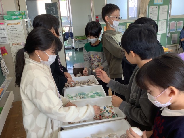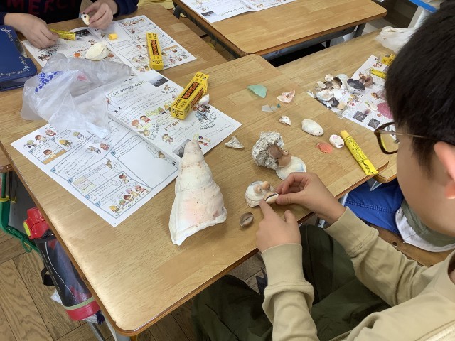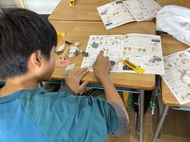 10/28 4年生シーボーンアート① 公開日 2025/10/28 更新日 2025/10/28 今日のできごと 4年生は9月に行った観音崎でたくさん貝を拾いました。今日はその貝も使いながらシーモンスターを作りました。講師は、「日本渚の美術協会」の先生です。「みんな、発想が豊かですね。」と褒めていただきました。