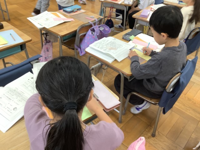せせらぎ公園で拾った木の葉やどんぐりの特徴をカードにどんどん書き出しました。