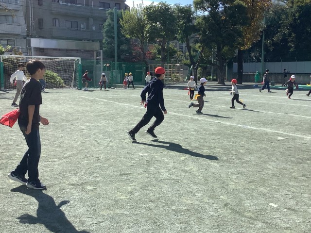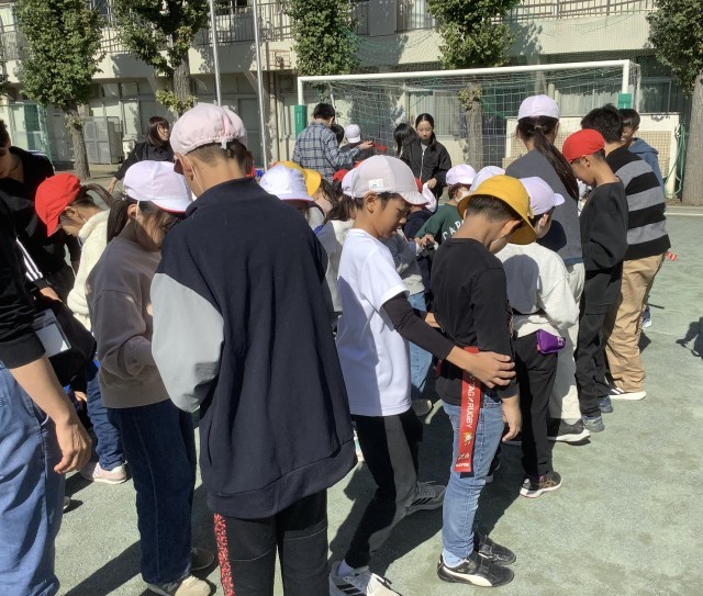 11/4 1年生と6年生遊びの交流 公開日 2025/11/04 更新日 2025/11/04 今日のできごと 1年生と6年生とでしっぽ取りのゲームをしました。1年生にしっぽをつけてあげてゲームのスタートです。6年生は1年生の走るスピードに合わせて上手に遊んであげていました。