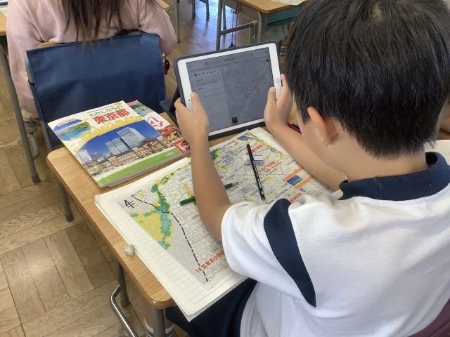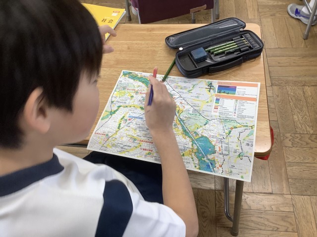 今日から自分達の街のオリジナルハザードマップを作ることになりました。