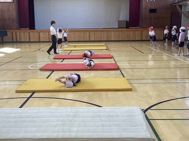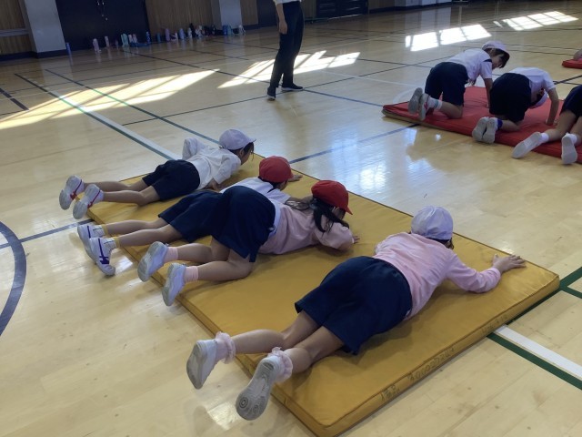 11/10 1年生体育 公開日 2025/11/10 更新日 2025/11/10 今日のできごと マット運動に取り組んでいます。ウォーミングアップでネコの動き、鉛筆コロコロの動きを行い、身体をほぐしました。
