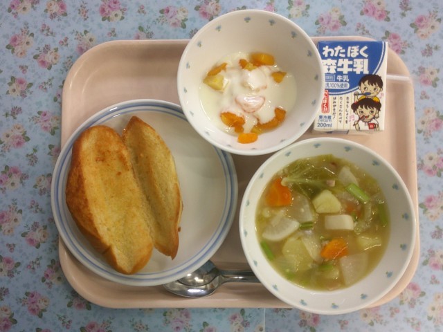 スコッチブロスは豆と大麦が入った具だくさんの野菜スープです。寒いときに体を温めてくれるスープでスコットランドではよく作られるそうです。今日は1年生が収穫したさつまいもが少しですが入っています。どの教室でも「今日の献立は最高!」と美味しそうに食べていました。