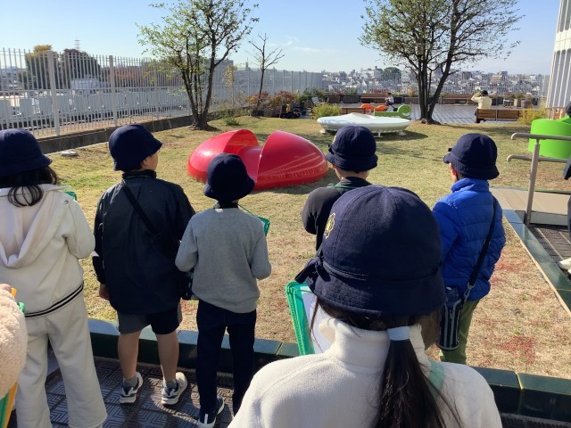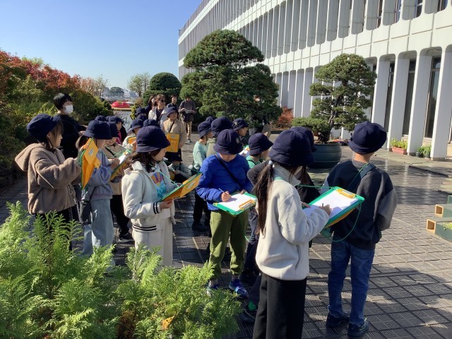 区役所の屋上庭園で緑化についてや自然を守るための取組に熱心に聞き入っていました。