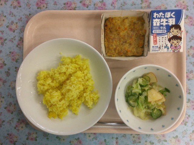 南アフリカ共和国料理です。イエローライスはターメリックの入った黄色のご飯です。本場ではシナモンなどの香辛料も入るそうですが食べやすいようにしています。ボボティーはナッツや香辛料が入ったミートローフの上に溶き卵をかけて焼き上げた料理です。給食ではカレー味のミートローフの上に溶き卵かけて焼きました。どの学年もよく食べていました。