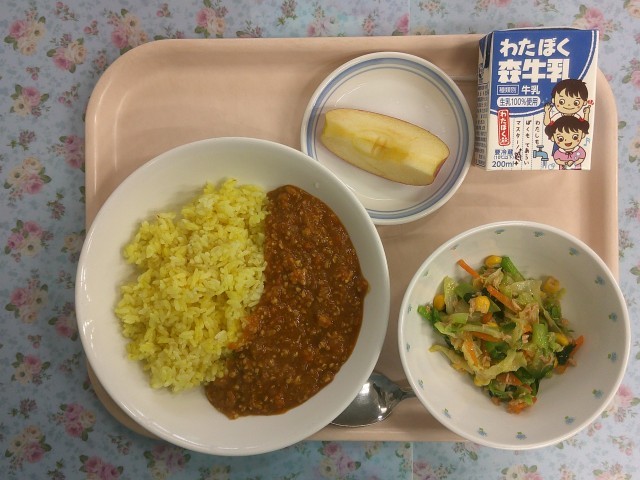キーマカレーはオールスパイス・ガラムマサラ・カレー粉の香辛料や赤ワイン・中濃ソース・塩・しょうゆ等の調味料を入れました。野菜の甘味とうまみがぎゅっと詰まったキーマカレーです。どのクラスもよく食べていました。