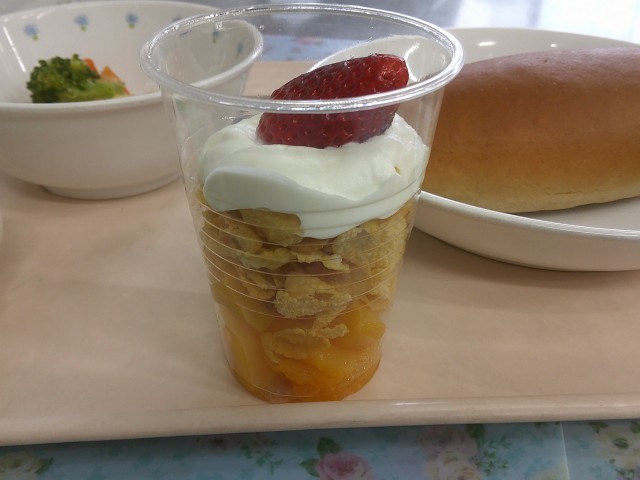今日は今年最後の授業日で、給食も最終日です。今年一年の締めくくりはお楽しみ給食にしました。「今年最後の日はフルーツパフェだね」と楽しみにしていた児童が多くいましたが、本物が配膳されると目をキラキラさせて嬉しそうにしていました。