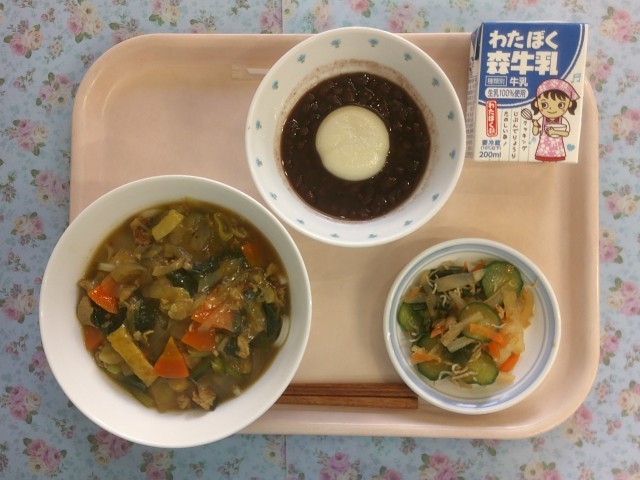 11日は鏡開きです。給食でもお餅の献立にしました。おしるこは、小豆をじっくり柔らかくなるまで煮て、砂糖・塩を入れて味をつけました。お餅は、オーブンで焼いて別に配缶しました。廊下が冷え込んですこし冷めてしまいましたが、おしるこが大好きな子は「おしるこ増やして」「お餅食べたい」と嬉しそうによく食べていました。