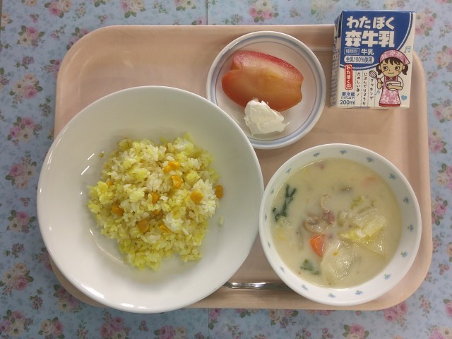 りんごのコンポートは、6年生からのリクエストです。紅玉を砂糖・レモン汁・赤ワイン・水を合わせたものを入れ、ティルティングパンで煮た後、冷めてから配缶しました。ホイップした生クリームをそえていただきます。どの献立もよく食べていました。