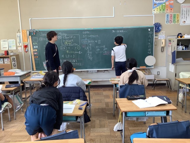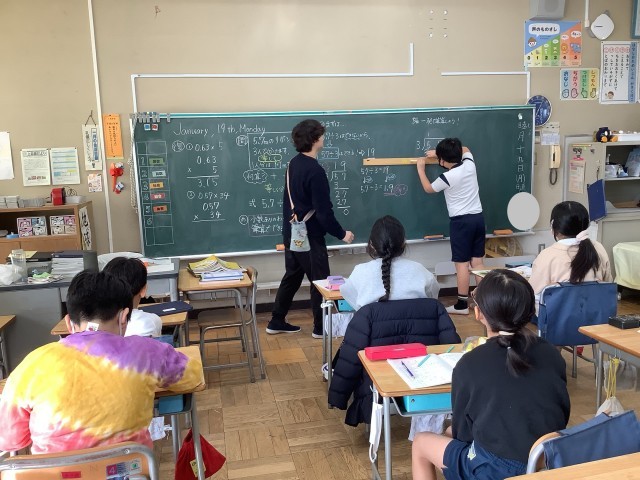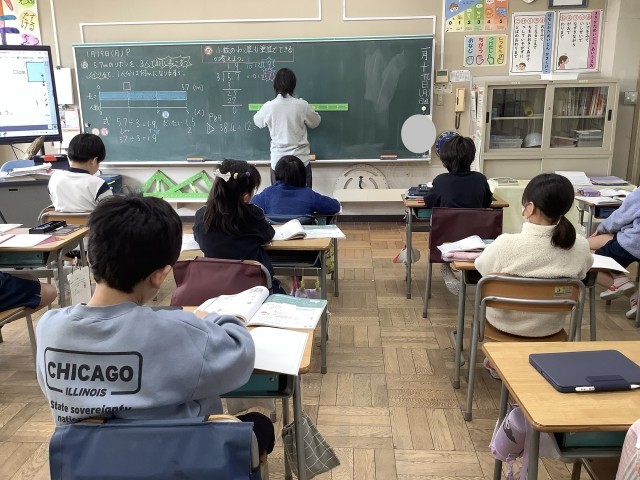 1/19 4年生算数 公開日 2026/01/19 更新日 2026/01/19 今日のできごと 小数のわり算をひっさんで計算する学習です。整数÷小数の計算仕方を自力解決した後、みんなで考えました。小数の意味や点の位置などを順を追って丁寧に確認しながら計算していました。