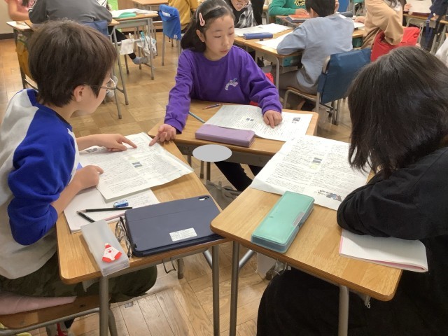 1/20 5年生国語 公開日 2026/01/20 更新日 2026/01/20 今日のできごと 「想像力のスイッチをいれよう」を自分の経験と結びつけて読み、メディアと自分との関わり方について考える学習です。今日は筆者が挙げた事例と筆者の意見を整理して読み込んでいきました。キーワードとなる言葉に着目しながら、班で話し合った意見を堂々と発表していました。