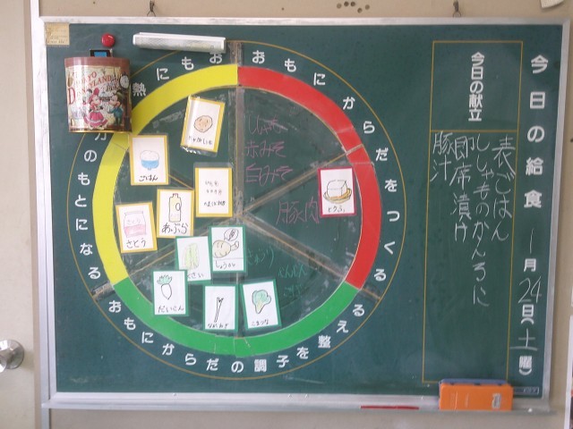 1月24日から30日まで「全国学校給食週間」です。給食について考えるきっかけとしてほしい1週間です。上目黒小学校では25・26日を除き、24日から30日まで給食の歴史を振り返ります。日本で最初の給食は、山形県の私立忠愛小学校で始まりました。その時の献立は、「塩むすび 焼き魚 漬物」だったそうです。今日は最初の給食に近い和食献立にしました。学校公開に合わせて、給食時間の様子を保護者の方に見ていただきました。