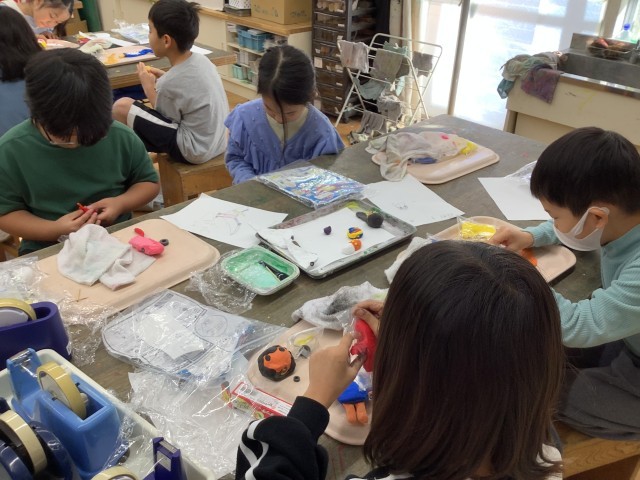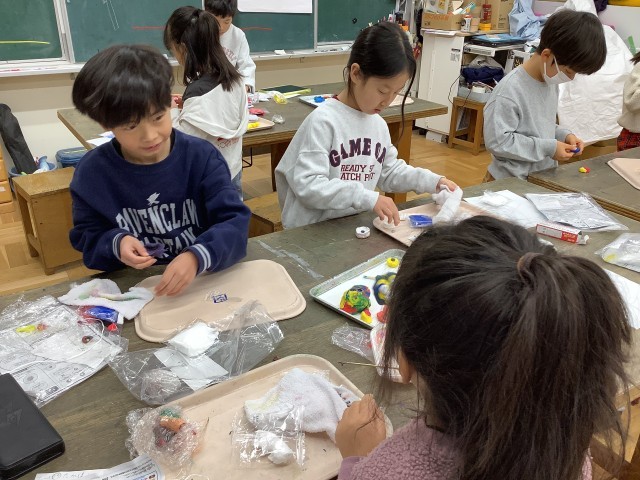 1/29 2年生図工 公開日 2026/01/29 更新日 2026/01/29 今日のできごと カラー紙粘土を使って、マグネットマスコットをつくっているところです。「何となくつくっていたら、ペロペロキャンディーみたいな形になってきたよ」「見て、見て!蓋を開けるとスイカになってるんだよ」と作品について楽しそうにお話ししながらつくっていました。
