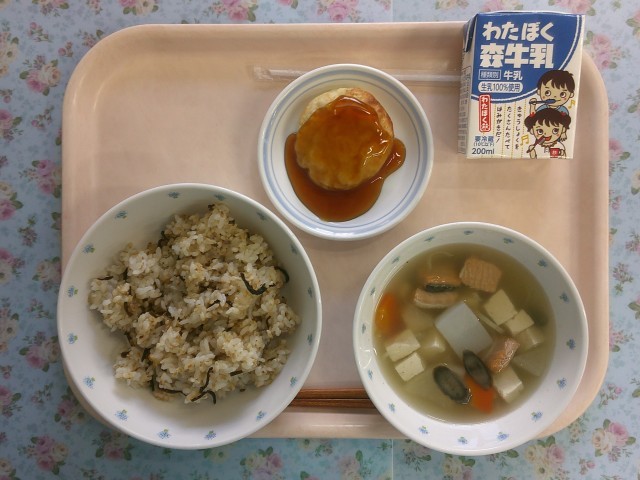 北海道の郷土料理の三平汁といももち、そして北海道の昆布を使った献立にしました。三平汁は、塩漬けにした魚が入った具沢山の汁物です。どれもとても人気でした。1年2組の児童は「三平汁は、北海道って味がします。北海道は魚が美味しいから。」という素敵な感想がありました。