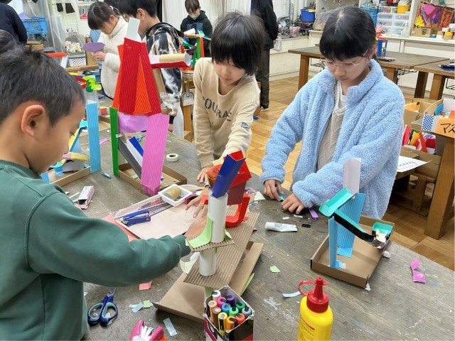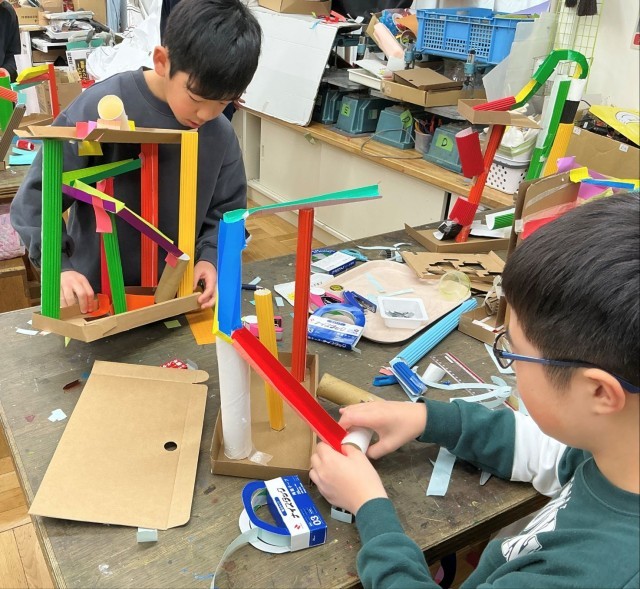 2/20 4年生図工「コロコロ ガーレ」 公開日 2026/02/20 更新日 2026/02/20 今日のできごと コロコロとビー玉が転がっていく道を紙でつくっています。どんな道にするか、思いついた工夫を試しながら夢中になって活動していました。