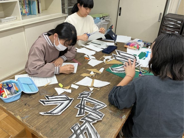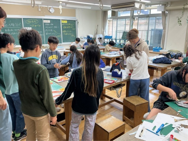 4/27 6年生図工「学校にひそむことば」 公開日 2026/04/27 更新日 2026/04/27 今日のできごと 先週の授業では学校にある(聞こえる)様々な音を集めました。「ざわざわ」「ギシギシ」「どきどき」等々、たくさんのオノマトペが集まりました。今日は集めた言葉を文字にデザインする授業の最終です。色、筆のタッチだけではなく、文字そのものを立体的にするなどの工夫もあり、見ごたえのある作品が出来上がりました。