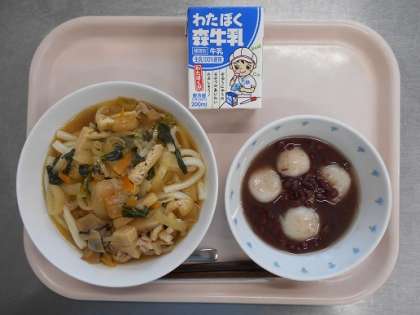 冷やし白玉しるこの小豆は朝から煮て砂糖・塩で味を付け冷まし、食缶に入れてから粗熱を取って、更に冷蔵庫で冷やしました。冷たくてほどよい甘さのデザートです。調理室で白玉粉と水を混ぜ、一つ一つ丸め手作りしています。