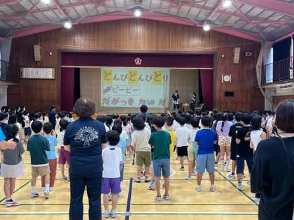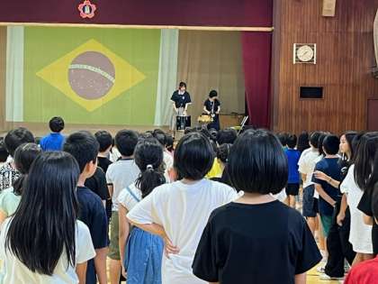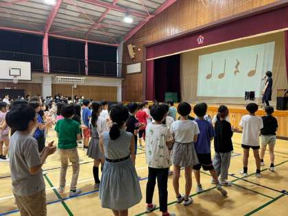 音楽集会の様子です。サンバのリズムをとりながら全校で楽しく歌いました。