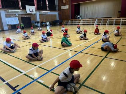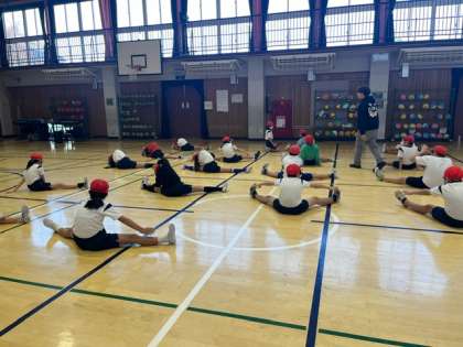 準備運動は入念に。柔軟では、体の固い子から「痛い、痛い」と声が出ました。ストレッチをしっかりやってから運動に入りましょう。