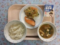 西京みそは、塩分が少なく甘味があり、淡いクリーム色をした京都で生まれたみそです。さわらに西京みそ・みりん等をまぜたものを1枚ずつまぶしつけて焼き上げました。焼き魚は苦手な児童が多いのですが、少しずつ食べ慣れ、おいしさに気づいてほしいと願っています。