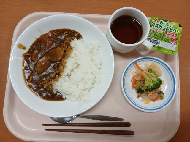 夕食の時間になりました。今日のメニューはチキンカレー、野菜サラダ、マスカットゼリーです。