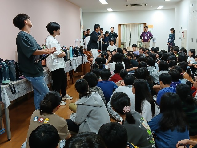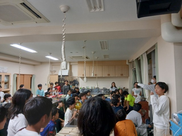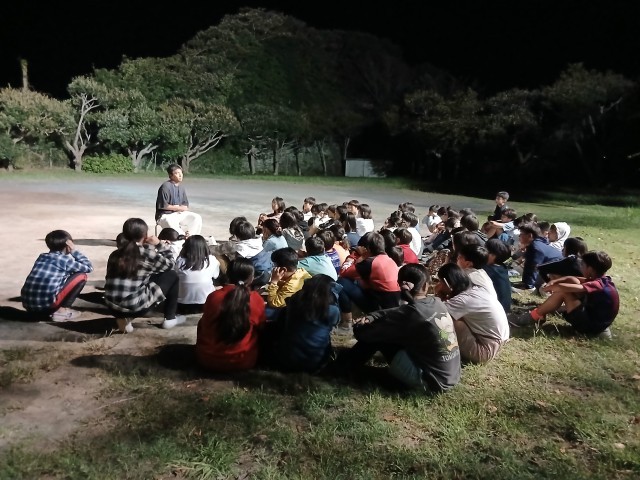 肝試しは前半グループがやっている間は、後半グループは多目的室でハガキ書きを行いました。全部のチームが回り終わると、食堂の外で集合。「今日の肝試しはどうでしたか」と感想を聞くと、大きな声で「楽しかった!」と返事が返ってきました。お化け役をやって子どもたちを楽しませてくれた指導員の方々にお礼を言って、肝試しは終わりました。