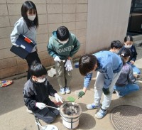 午後はみねおかいきいき館で、草木染め又は竹明かりの体験をしました。写真は草木染めの様子です。今回はびわの葉で染めました。赤い液体に2回付けて、淡い赤茶色に染まりました。