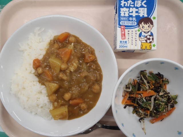 ・ひよこ豆のカレーライス ・茎わかめとツナのサラダ ・牛乳